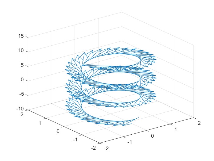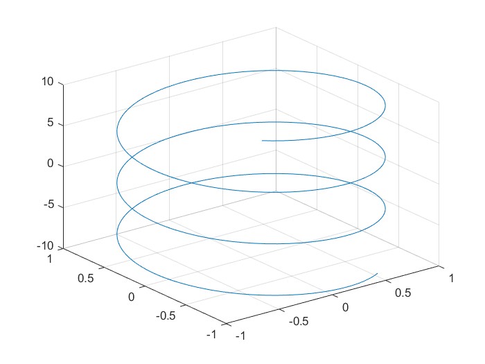 벡터 함수란 위의 예시처럼 매개 변수 t 에 대해서 3차원 공간 상의 점의 좌표를 갖는 함수이다. 즉, 실수에 벡터를 대응시키는 함수이다. 이제 매트랩에서 함수 정의를 하고 t 의 구간 -10부터 10까지 그래프를 그려보자.