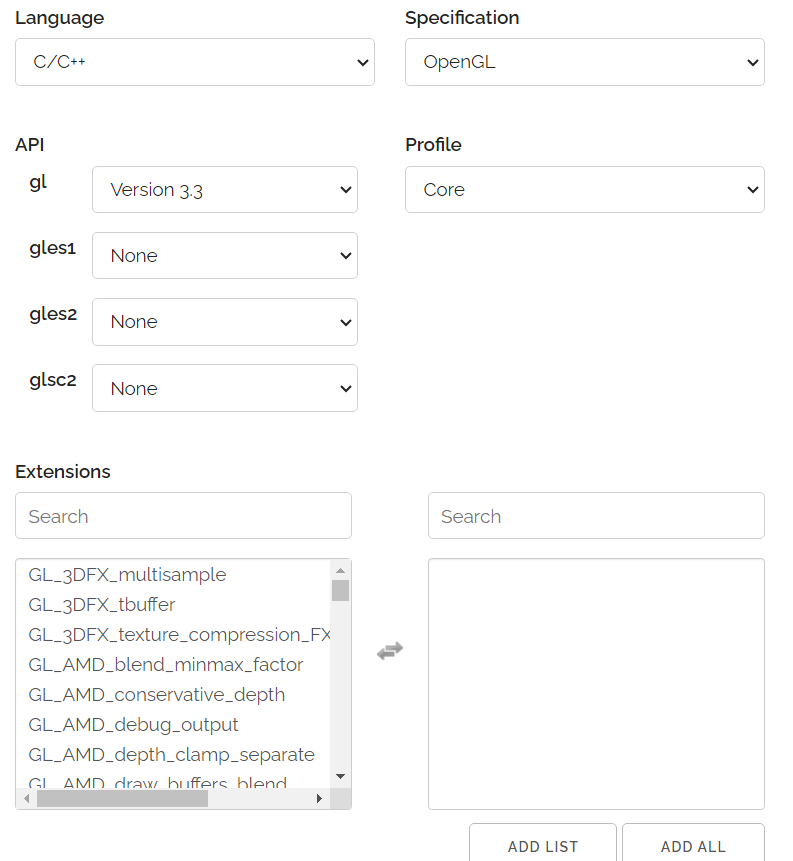 이 블로그는 OpenGL을 MFC라는 Microsoft 사가 제공하는 Library를 통해 진행하려고 한다. IDE는 Visual Studio를 사용하며, 이유는 Microsoft SDK에는 기본적으로 opengl32.lib이 지원되어 Visual Studio 설정에서 linker에 포함만 시키면 사용 가능하며, MFC는 OpenGL context를 쉽게 만들 수 있기 때문에, 너무나도 오래되었지만 그래도 사용하고자 한다! Microsoft SDK에서 제공하는 opengl32.lib은 version 1.1이기에, 더 높은 version을 사용하기 위해 GLAD를 다운 받자.
