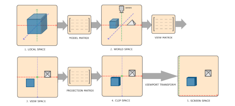 Local Space와 가장 큰 차이점은 관찰자, 즉 그림에 나와있다시피, 카메라가 있다는 점이다. 관찰자가 있으니, 관찰자를 기준으로 상대적인 좌표가 정해진다. Local Space에서 World Space로 넘어올 때, Model Matrix를 거친다. 이 Model Matrix를 통한 변환으로 (matrix multiplication, 선형 대수학..!) object들의 위치가 정해진다. Roate(회전), translate(평행이동) 등등.