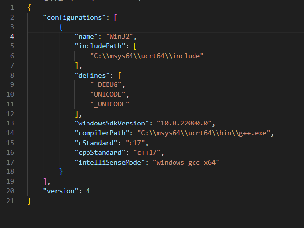 5번째 줄에 "includePath"와 14번째 줄에 "compilerPath"를 ucrt64 또는 선호하는 compiler의 경로를 넣어주면 된다.