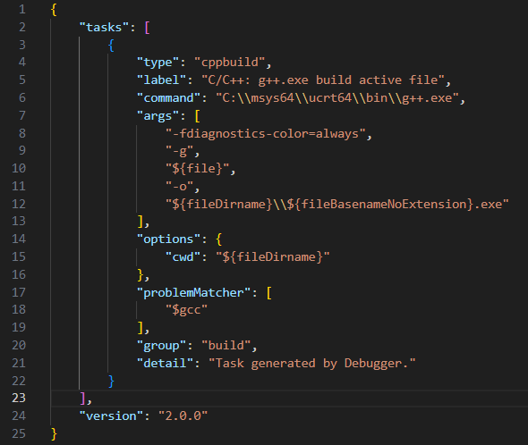 6번째 줄에 "command"를 컴퓨터에 g++. exe의 경로를 등록해 주자. msys64를 다운로드하면 mingw, ucrt, clang 이 있는데, 개인적으로 ucrt를 사용 중이다. Windows 운영체제에서는 ucrt와 mingw를 추천하며 큰 차이는 없다.