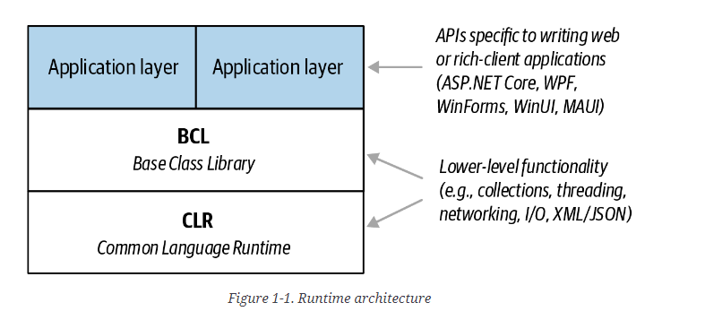 모든 C# 애플리케이션은 기본적인 Runtime으로 CLR을 갖는다. Microsoft는 F#, Visual Basic, C#을 갖고 있으며 CLR을 통해 기기에 특화된 기계 언어 (Machine Code)로 변경한다. 그보다 위에 있는 BCL은 공통으로 C#이 지원하는 Collection(리스트, 덱, 힙) 등이 있으며 유용한 기능이 많다. Application Layer은 가장 위에 있는 계층으로 만들고자 하는 애플리케이션, 웹, 서버 등 사용자의 의도에 따라 결정된다.