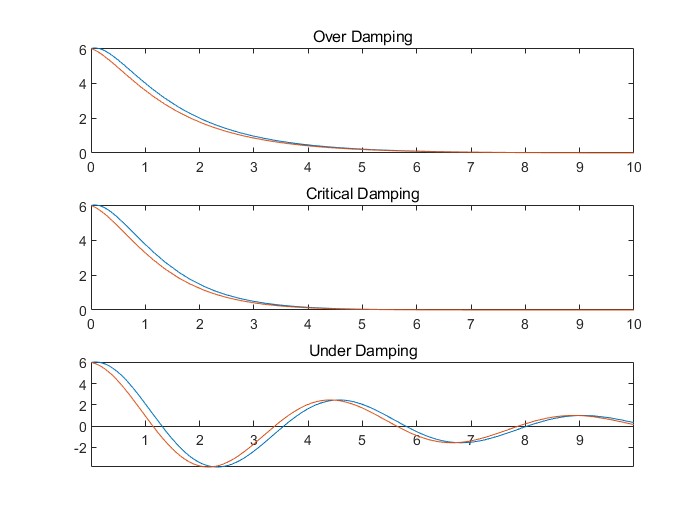 용수철 운동의 세 가지 대표적인 운동에 대해 알아 보았고 마지막으로 matlab 'subplot' 을 이용해서 3개의 그래프를 한번에 표시해보자.