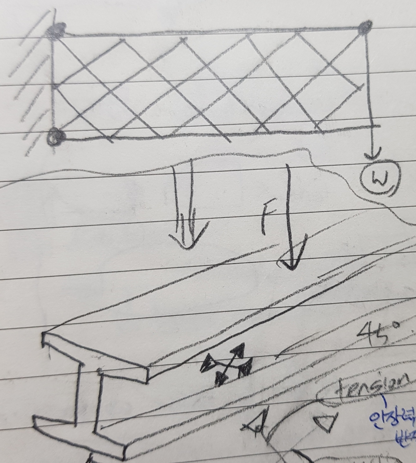 위의 트러스를 연속적인 그리드화를 시켜서 보로 가져온다. 트러스에서와 마찬가지로 인장력, 압축력이 대각 방향(45도)으로 작용하고, 밑에 I 형 단면 보를 보면 위와 아래는 트러스에서 2,4,6,8 역할을 하고, 중간에 새로로 긴 부분은 1,3,5,7의 역할을 한다. 그리고 보가 수직하중을 받아서 생기는 대각 방향의 인장력, 압축력의 교차된 힘을 전단력이라고 부른다.